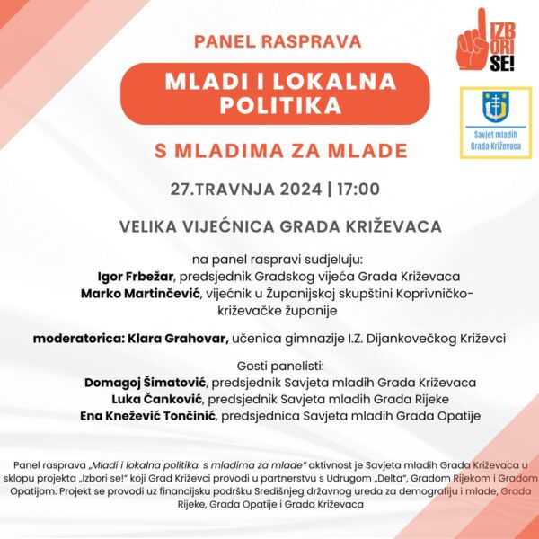 Panel rasprava „Mladi i lokalna politika: s mladima za mlade“ aktivnost je Savjeta mladih Grada Križevaca u sklopu projekta „Izbori se!“ koji Grad Križevci provodi u partnerstvu s Udrugom „Delta“, Gradom Rijekom i Gradom Opatijom. Projekt se provodi uz financijsku podršku Središnjeg državnog ureda za demografiju i mlade, Grada Rijeke, Grada Opatije i Grada Križevaca.