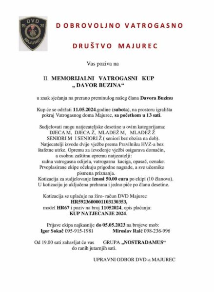Dobrovoljno vatrogasno društvo Majurec 11. svibnja organizira II. Memorijalni vatrogasni kup “Davor Buzina”.