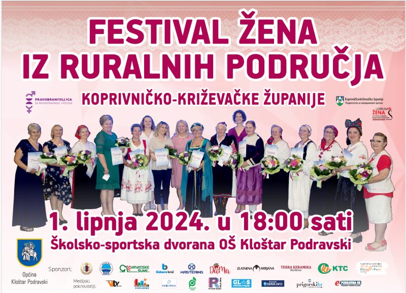 Županijsko Povjerenstvo za ravnopravnost spolova i Udruga žena iz ruralnih područja upućuju poziv na Festival žena iz ruralnih područja u subotu 01. lipnja u 18 sati u Školsko-sportsku dvoranu OŠ Kloštar Podravski.