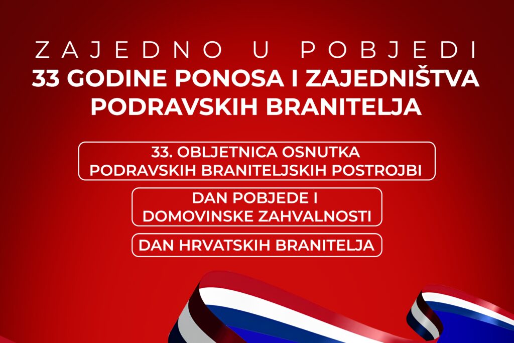 Povodom Dana pobjede i domovinske zahvalnosti, Dana hrvatskih branitelja i 33. Obljetnice osnutka podravskih braniteljskih postrojbi, Ministarstvo hrvatskih branitelja RH i Udruga hrvatskih branitelja RH u suradnji s 3. bojnom 105 brigade, Udrugom branitelja MUP-a, HVIDROM Đurđevac, Hrvatskim časničkim zborom, SLAB PZO Đurđevac, Gradom Đurđevcom, podravskim općinama i Koprivničko-križevačkom županijom organizira događanje Zajedno u pobjedi – 33 godine ponosa i zajedništva.