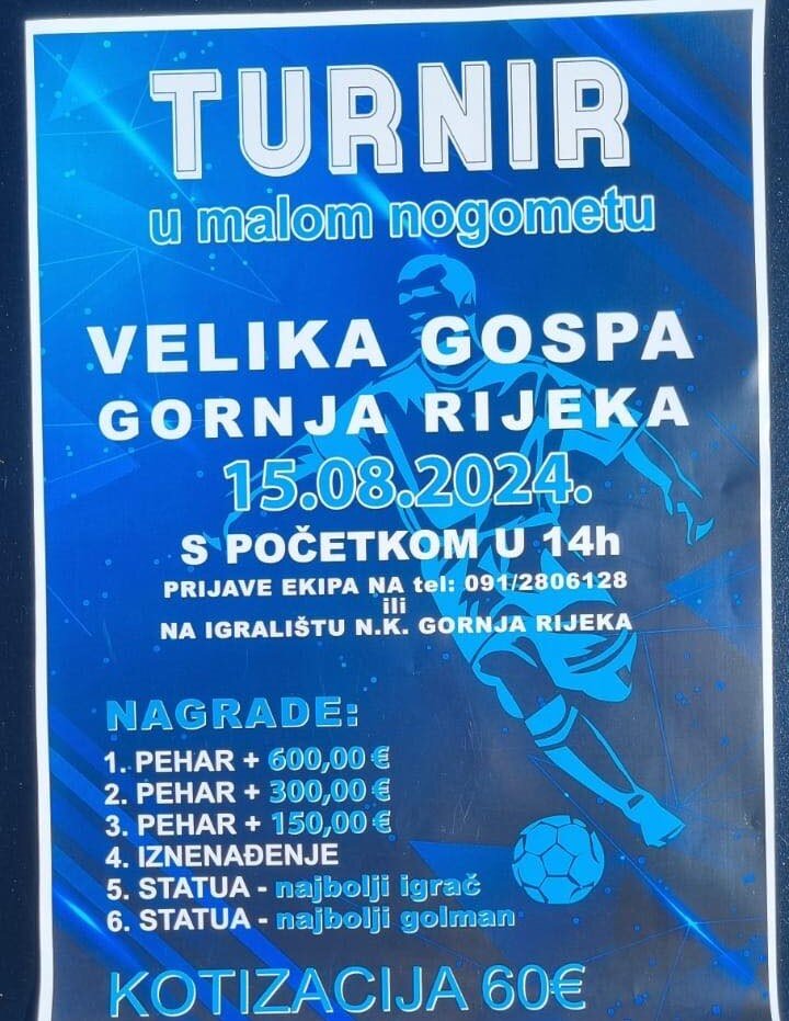Turnir u malom nogometu odigrat će se na blagdan Velike Gospe u Gornjoj Rijeci. Osigurane su vrijedne nagrade, kotizacija će biti 60 eura, a malonogometna uzbuđenja kreću u 14 sati.