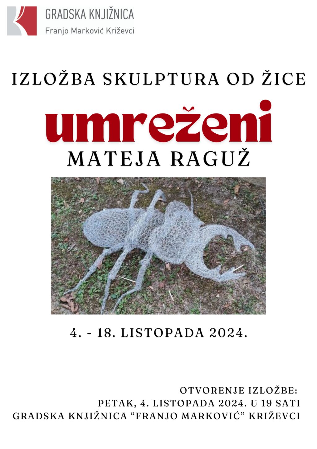 Otvorenje izložbe kiparskih radova Mateje Raguž ‘Umreženi’, održat će se u petak 4. listopada s početkom u 19 sati u Gradskoj knjižnici “Franjo Marković” Križevci.