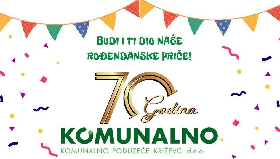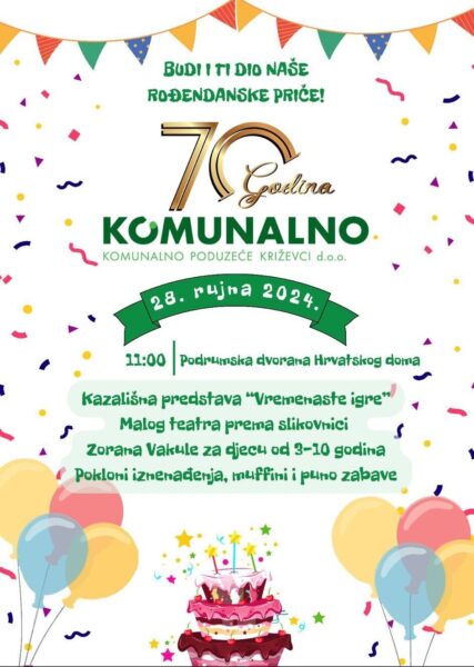 “Draga djeco i roditelji, povodom našeg 70. rođendana pozivamo vas na kazališnu predstavu “Vremenaste igre” Malog teatra iz Zagreba prema slikovnici Zorana Vakule. Predstava će se održati u subotu, 28. rujna u 11 sati u Podrumskoj dvorani Hrvatskog doma. Očekuju vas pokloni, muffini i puno zabave”, poručili su iz Komunalnog poduzeća Križevci.