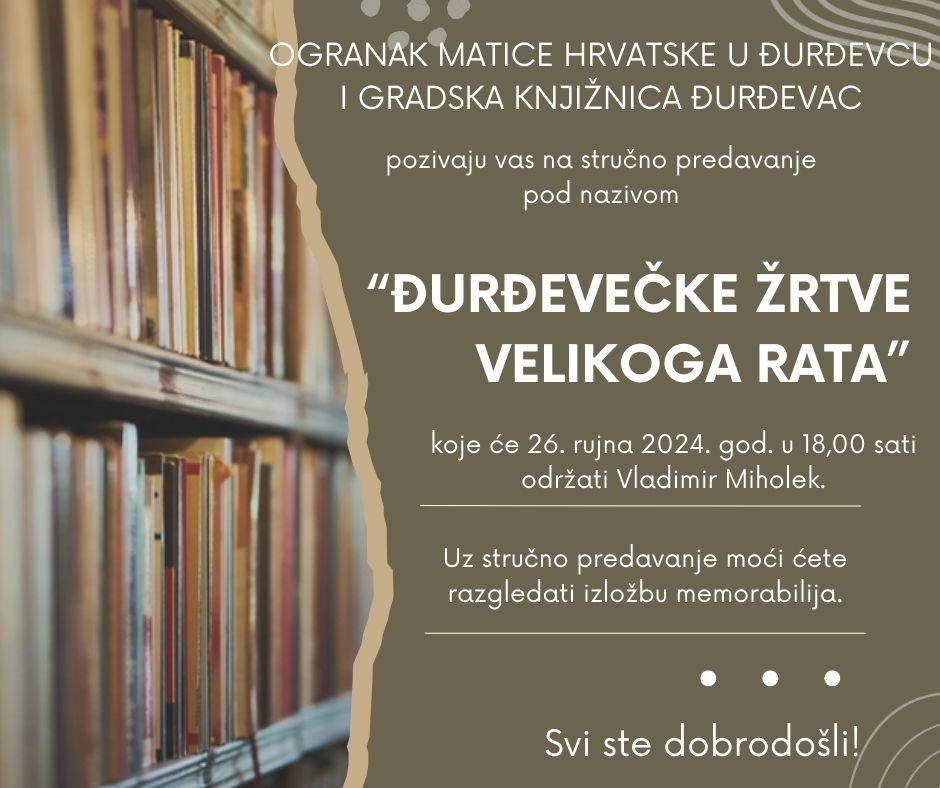 Ogranak Matice hrvatske u Đurđevcu i Gradska knjižnica Đurđevac pozivaju vas na stručno predavanje pod nazivom “Đurđevečke žrtve Velikoga rata” koje će 26. rujna 2024. godine s početkom u 18,00 sati održati Vladimir Miholek.