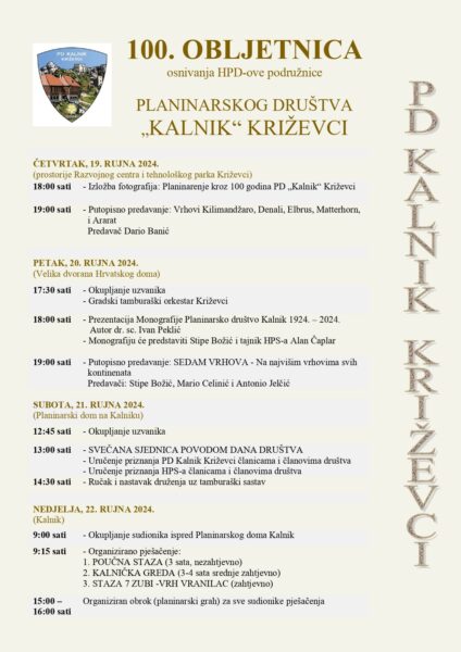 Planinarsko društvo ‘Kalnik’ obilježava 100. obljetnicu od osnutka. Obilježavanje započinje u četvrtak, 19. rujna, a trajat će do nedjelje 22. rujna.
