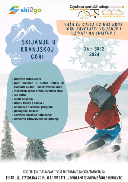 U razdoblju od 26. do 30. prosinca Zajednica sportskih udruga Grada Đurđevca organizira odlazak djece na zimovanje i skijanje u Kranjsku Goru.