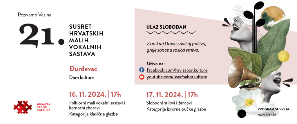 16. i 17. studenog 2024. u Domu kulture u Đurđevcu predstavit će se ponajbolji domaći vokalni sastavi u okviru 21. Susreta hrvatskih malih vokalnih sastava.