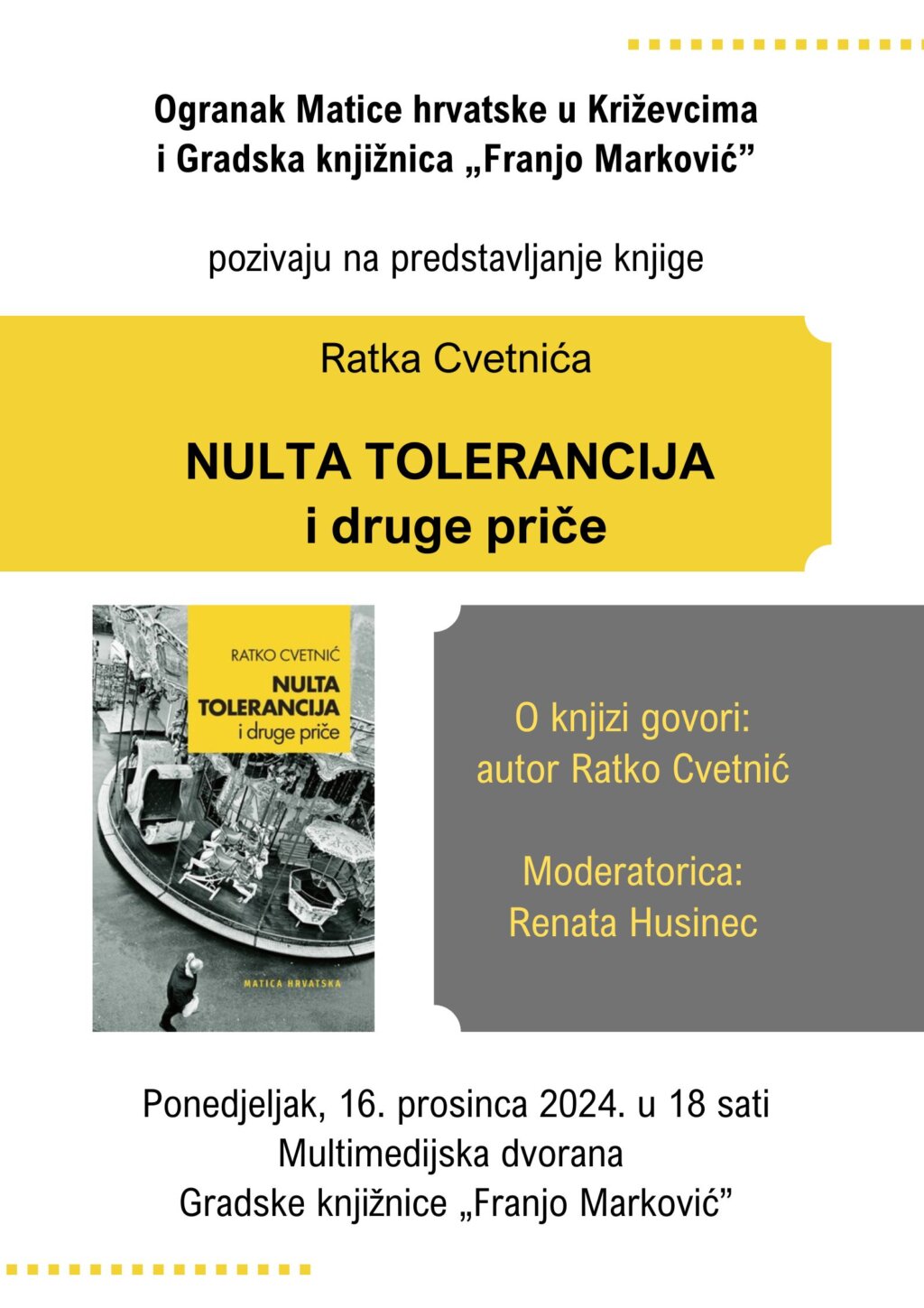 Ogranak Matice hrvatske u Križevcima i Gradska knjižnica “Franjo Marković” organiziraju predstavljanje knjige Ratka Cvetnića “NULTA TOLERANCIJA i druge priče”. Knjigu će predstaviti autor, a moderatorica je Renata Husinec.