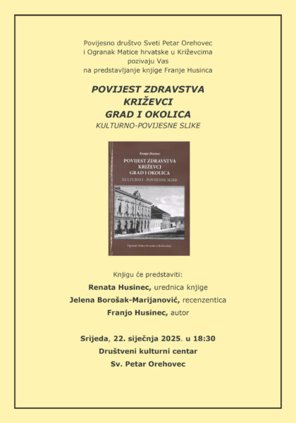 Povijesno društvo Sveti Petar Orehovec i Ogranak Matice hrvatske u Križevcima organiziraju predstavljanje knjige Franje Husinca “Povijest zdravstva. Križevci. Grad i okolica. Kulturno-povijesne slike”.