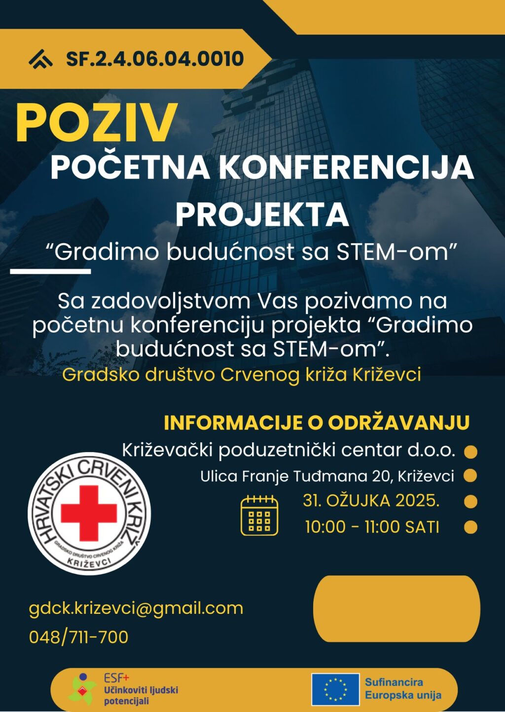 Gradsko društvo Crvenog križa Križevci organizira u ponedjeljak 31.3.2025. godine u 10:00 sati početnu konferenciju projekta „Gradimo budućnost sa STEM-om“. Projekt je apliciran na poziv Jačanje kapaciteta OCD-a za promociju STEM-a u okviru Europskog socijalnog fonda plus, Program učinkoviti ljudski potencijali 2021.-2027.