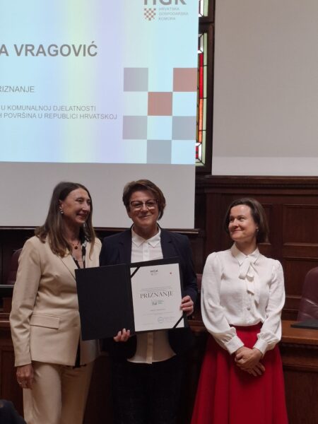 Djelatnica poduzeća Mariji Vragović dobila je priznanje za osobni doprinos u komunalnoj djelatnosti održavanja javnih zelenih površina u Republici Hrvatskoj.