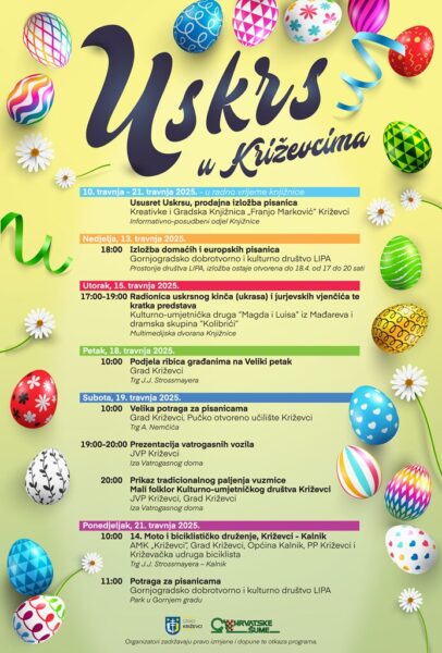 Potraga za pisanicama počinje u 10,00 sati, a sakrit će se čiste bijele pisanice koje će po završetku potrage djeca moći ukrasiti na radionici oslikavanja pisanica koju će voditi Boris Kralj, nagrađivani autor slikovnica za djecu. Tri najljepše ukrašene i nacrtane pisanice osvojit će prigodne nagrade. Osim radionica, organizirane su maskote, a moći će se vidjeti i način ukrašavanja pisanica križevačkom čunčanom čipkom. Organizatori potrage za pisanicama su Grad Križevci i Pučko otvoreno učilište Križevci.