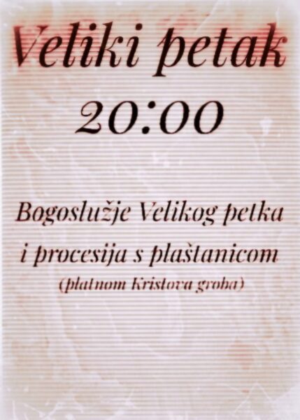 U nastavku donosimo raspored bogoslužja u Svetom trodnevlju s naglaskom na svečanu procesiju na Veliki petak navečer:
