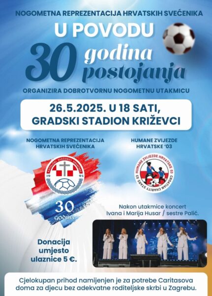 Nogometna reprezentacija hrvatskih svećenika u povodu tri desetljeća postojanja u Križevcima organizira dobrotvornu humanitarnu utakmicu koja će se odigrati 26. svibnja u 18 sati na Gradskom stadionu u Križevcima.