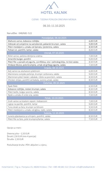 TJEDNI MENU Tjedni menu – Hotel Kalnik 05/10/2025 Tags: tjedni menu Continue Reading Prijašnja vijest Tjedni menu – Restoran Klara Propustili ste: TJEDNI MENU Tjedni menu – Restoran Klara 28/09/2025 TJEDNI MENU Tjedni menu – Restoran Klara 06/02/2024