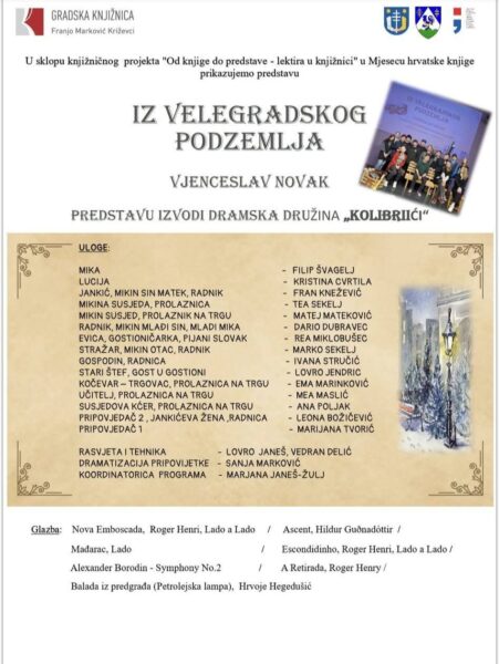 Povodom obilježavanja Mjeseca hrvatske knjige Dramska družina “Kolibrići” koja djeluje pri Gradska knjižnica “Franjo Marković” Križevci prikazala je u Hrvatskom domu predstavu “Iz velegradskog podzemlja”, nastalu prema poznatoj noveli Vjenceslava Novaka.