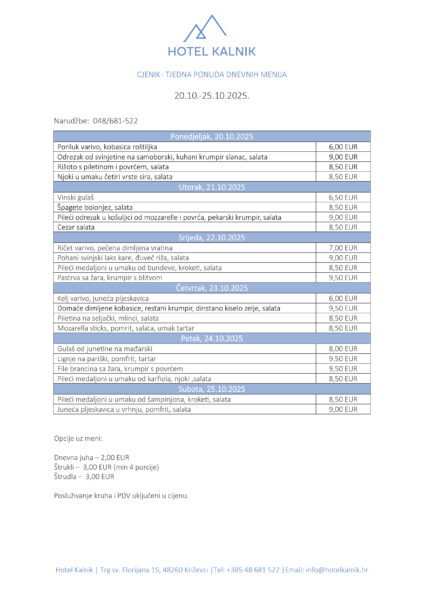 OGLASI Tjedna ponuda Hotela Kalnik 20.10.-25.10. 20/10/2025 Vjekoslav Continue Reading Prijašnja vijest Tržnica Radija KriževciSljedeće Tjedni meni Restorana Klara Križevci 20.10.-25.10. Propustili ste: OGLASI TJEDNI MENI RESTORANA KLARA 28.10.- 3.11. 27/10/2025 Vjekoslav OGLASI TJEDNI MENI RESTORANA KALNIK 27.10. – 01.11. 27/10/2025 Vjekoslav OGLASI Tržnica Radija Križevci 27.10.2025. 27/10/2025 Vjekoslav