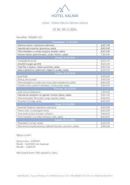OGLASI TJEDNI MENI RESTORANA KALNIK 27.10. – 01.11. 27/10/2025 Vjekoslav Tags: JELOVNIK, KALNIK Continue Reading Prijašnja vijest Tržnica Radija Križevci 27.10.2025.Sljedeće TJEDNI MENI RESTORANA KLARA 28.10.- 3.11. Propustili ste: OGLASI TJEDNI MENI RESTORANA KLARA 28.10.- 3.11. 27/10/2025 Vjekoslav OGLASI Tržnica Radija Križevci 27.10.2025. 27/10/2025 Vjekoslav OGLASI Tržnica Radija Križevci 24.10.2025. 24/10/2025 Vjekoslav