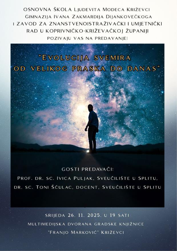 Osnovna škola Ljudevita Modeca, Gimnazija Ivana Zakmardija Dijankovečkoga i Zavoz za znanstvenoistraživački i umjetnički rad u Koprivničko-križevačkoj županiji pozivaju Vas na predavanje Evolucija svemira od velikog praska do danas u srijedu 26. studenoga 2025. u 19 sati u multimedijskoj dvorani Gradske knjižnice “Franjo Marković” Križevci.