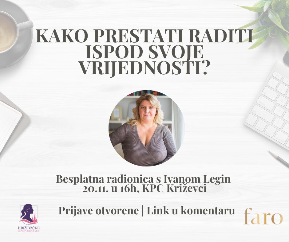 radionicu pod nazivom “Kako prestati raditi ispod svoje vrijednosti”, koja će se održati u