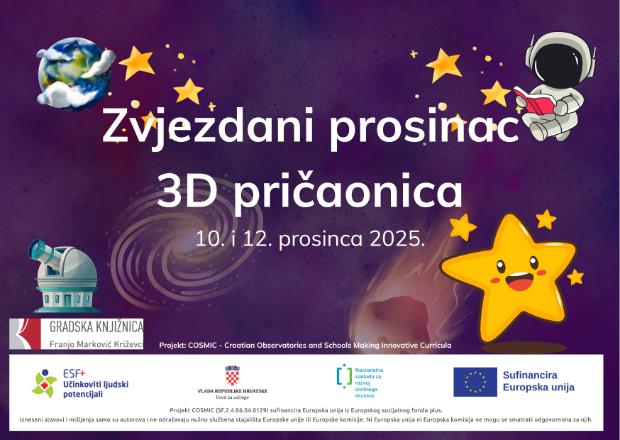Projekt COSMIC (Croatian Observatories and Schools Making Innovative Curricula) astronomskog društva Perzeidi u Križevcima nastao je s ciljem promicanja prirodnih znanosti i tehničkih disciplina kroz inovativne obrazovne programe i javna događanja. Projekt će trajati tri godine, a  Gradska knjižnica “Franjo Marković” Križevci kao jedan od partnera sudjeluje s 3D pričaonicama i radionicama “Učenje kroz igru”. Više o samom projektu pročitajte na poveznici Cosmic